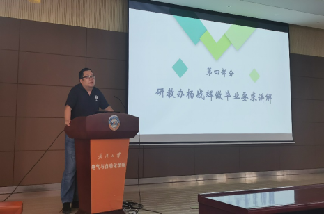 大会最后一项,由研教办杨战辉老师讲解毕业要求。杨老师从应修学分、资格论文和学术签到次数展开讲解,逐一分析了各项条件的毕业标准。杨老师指出各位同学要保持学术诚信,确保学位论文的质量。