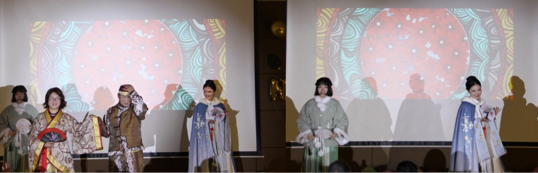 下午14点整,联欢会在学院办公室带来的服装秀表演——《龙腾虎跃贺新年》中隆重拉开大幕。老师们把舞台当成了T台,一改平日里的严肃形象,化身模特儿为大家表演时装走秀,赢得了场下热烈的掌声。