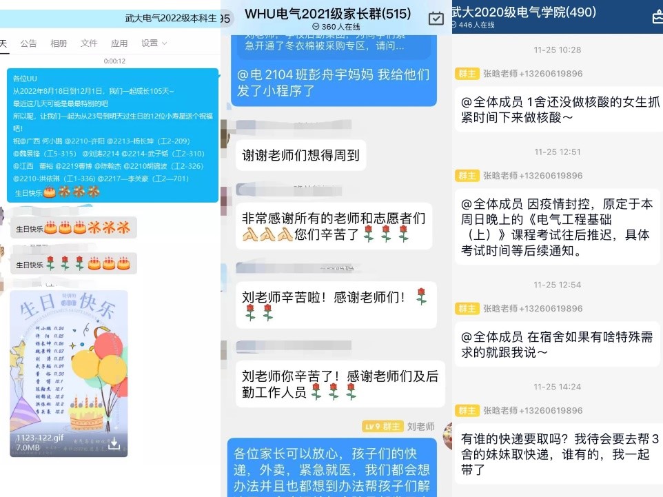 特别的日子,如何在寝室提升学习效率、排解烦闷情绪?班主任老师积极召开的线上班会,十八般武艺闪亮了封寝生活;每天活跃在各楼的层长和志愿者是楼里最不可或缺的灵魂人物;学院团委学生会的文艺骨干把一百多首歌“唱给你听”;小亭志愿服务中心的天使们策划“初雪信使”活动,十分钟内二十余名志愿者报名送件,这个冬天,让我为你做点什么;还有年级群里为这一周过生日小伙伴们送来的“零点”祝福……