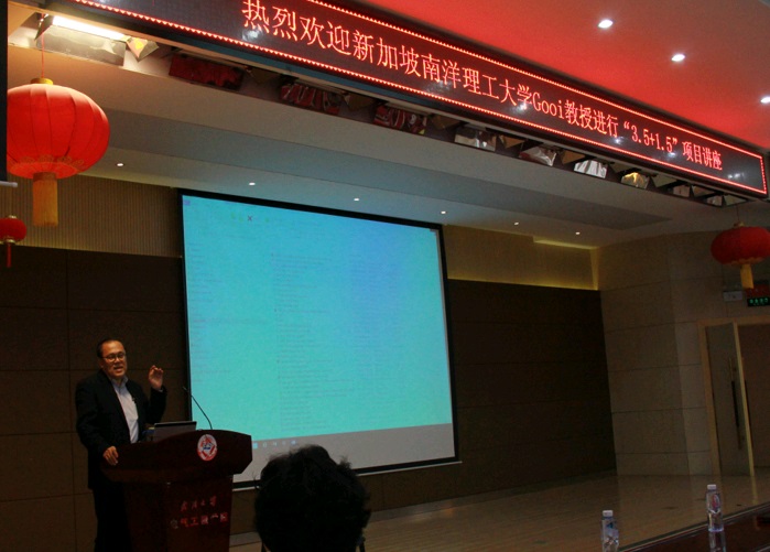 的40多名学生进行了“NTU-WHU联培3.5+1.5项目”留学讲座和咨询。Gooi教授介绍了NTU及电机与电子工程学院课程体系、研究生培养方案等情况。而作为该项目的第一批参与者,赴NTU攻读了硕士、博士学位并留校任教的电气校友唐燚副教授则以自己的亲身经历为例,详细介绍了该项目实施情况、学生学习情况及职业规划等,最后针对学生们提出的具体问题进行了交流。会场气氛热烈,效果良好。