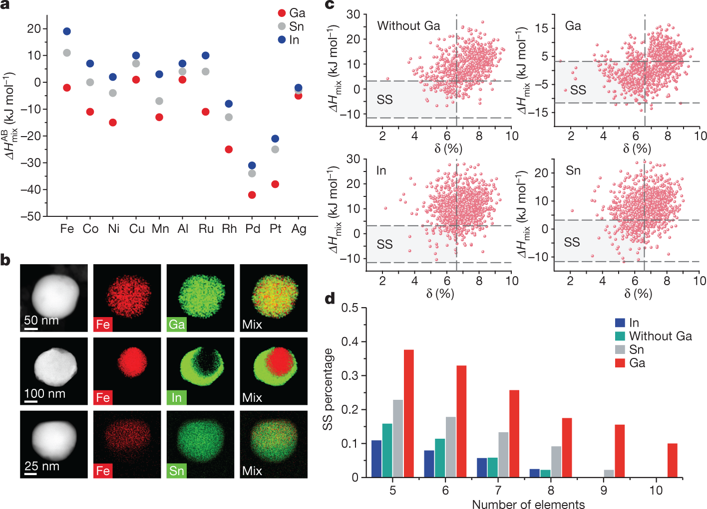 混合焓对高熵合金形成的影响。(a)液态金属(Ga、In和Sn)与其他金属的二元混合焓统计。(b)二元合金的EDS Mapping图。(c)含有Ga、In、Sn以及不含Ga合金体系的混合焓和原子尺寸差异参数的分布图。(d)具有不同组元数目的上述四种体系的固溶相比例统计图。