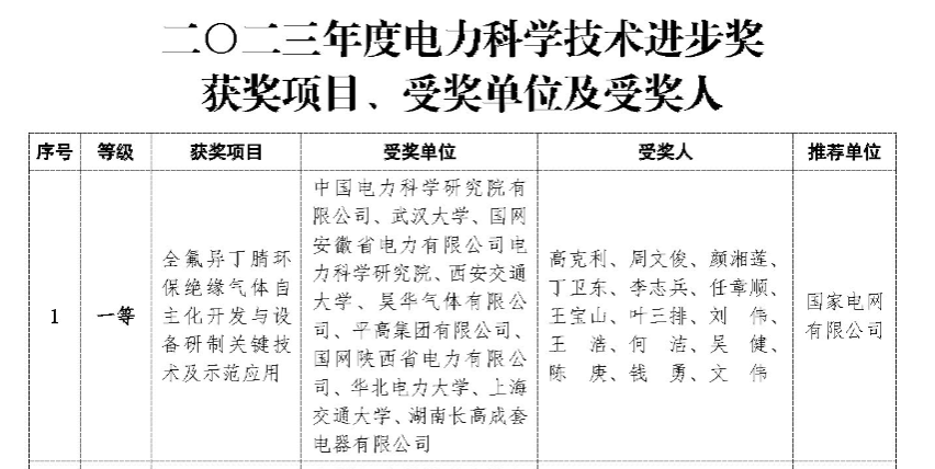 、国网安徽电力科学研究院、西安交通大学、昊华气体有限公司、平高集团有限公司、国网陕西省电力有限公司、华北电力大学、上海交通大学、湖南长高成套电器有限公司等10余家单位合作完成,研制出用于电网设备SF6替代的C4F7N/CO2混合气体环保化应用解决方案,极大地提升了我国环保设备核心竞争力,对我国电网设备环保升级具有重要的技术创新引领作用,在促进电力行业SF6替代的“降碳减排”方面向前迈进了一大步。
