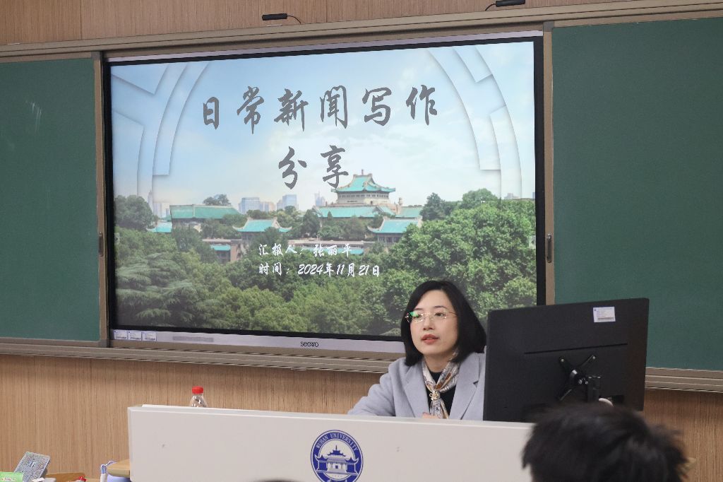 张丽平进行日常新闻写作分享。她从新闻体裁特点和写作技巧两大方面入手,指出宣传语言应注重“三个讲究”:逻辑性、新颖性和感染力,在撰稿时应精准抓住事件核心,通过“倒金字塔”结构快速吸引读者关注。她结合学术成果报道和师生活动宣传等实际案例,全面讲解了如何在不同类型的新闻中突出学院特色,并给学院宣传团队提出了实用建议:准确把握新闻撰写角度,避免常识性错误;努力契合学校宣传所设置的栏目或板块,凝练富有学院特色的活动典型;积极探索融媒体建设,争取校外媒体发声等。