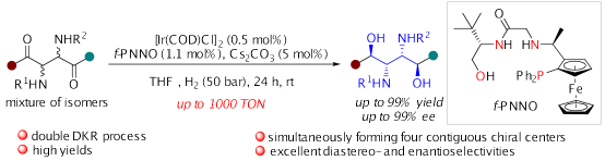 在本研究中,合作团队利用开发的Ir/f-PNNO催化体系对外消旋2,3-二氨基-1,4-二酮的不对称氢化进行研究,利用连续动态动力学拆分策略,实现了含四个连续立体中心的手性邻二胺的高效合成。值得注意的是,该反应展现出优异的对映选择性和非对映选择性,能立体专一性地从32种可能的还原产物中生成单一目标手性分子。该反应的底物普适性好,催化效率高,使用0.1 mol % 的催化剂即可顺利实现产物克级规模的制备,为结构多样、功能丰富的手性邻二胺的高效合成提供了简捷实用的新途径。此外,所得产物中的手性邻二胺及氨基醇单元具有丰富的化学转化,可广泛应用于配体以及手性功能分子的合成中。机理研究表明,该转化经历了两次动态动力学拆分过程。在后续研究中,该团队将进一步优化手性功能分子的化学结构/立体结构,同步提升环保液体绝缘介质的多个性能指标。