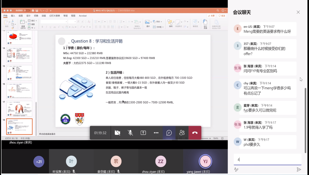 首先,Gooi教授介绍了新加坡南洋理工大学的学校概况,以及近年来联合培养项目的选拔情况,并建议大家尽早准备出国所需材料,加强英语口语练习。随后,Michelle老师在课程内容、学制、学费、宿舍安排等方面进行了补充讲解。