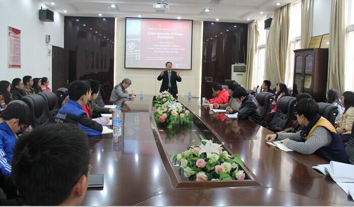 期间,刘镇钦(CCLiu)教授在12日和13日上午在院长助理林涛教授的主持下分别作了题为《Cyber security of substations》和《Dynamics and protection involving off shore wind farms》的学术报告。在第一场报告中刘教授首先介绍了变电站网络安全存在的威胁,然后提出一种综合的入侵检测系统,基于对攻击相似性和影响因子的分析及物理网络测试,对电力系统中所有节点的网络安全程度进行了计算,并且依据网络攻击行为特性以及目的,讨论了如何从数据上远方发现并处理网络攻击,提出了系统中同时发生多个网络攻击时的检测方法。在第二场报告中刘教授首先向我们介绍了海上风电的开发现状与其高压直流接入技术的发展,接着提出了一种用于长期稳定性分析的高压直流输电的动态等效阻抗模型,并应用它设计了一种用于防止故障后电压崩溃的减载策略,然后刘教授又针对风电的直流接入可能给交流侧系统的距离保护带来的不利影响,提出了一种视在阻抗估算方法。最后刘教授也结合自身的人生经历对在座的同学们提出了宝贵的建议,鼓励大家积极参与高水平国际会议和学术活动。两场学术报告场场爆满,众多研究生同学由于没有座位站着旁听了两场报告。