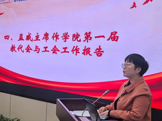 首先校工会副主席黄丽同志为大会致辞。黄丽副主席代表校工会向此次教代会暨工代会的顺利召开表示热烈祝贺,向全体教职工致以亲切问候。黄丽副主席充分肯定了学院在教学、科研和教职工权益保障等方面的工作成绩,希望学院能以此次会议为契机,进一步凝聚教职工力量,推动学院各项事业迈向新台阶。