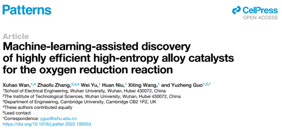Machine-learning-assisted discovery of highly efficient high-entropy alloy catalysts for the oxygen reduction reaction, X. Wan#, Z. Zhang#, W. Yu, H. Niu, X. Wang, and Y. Guo*,Patterns,3, 100553 (2022)
