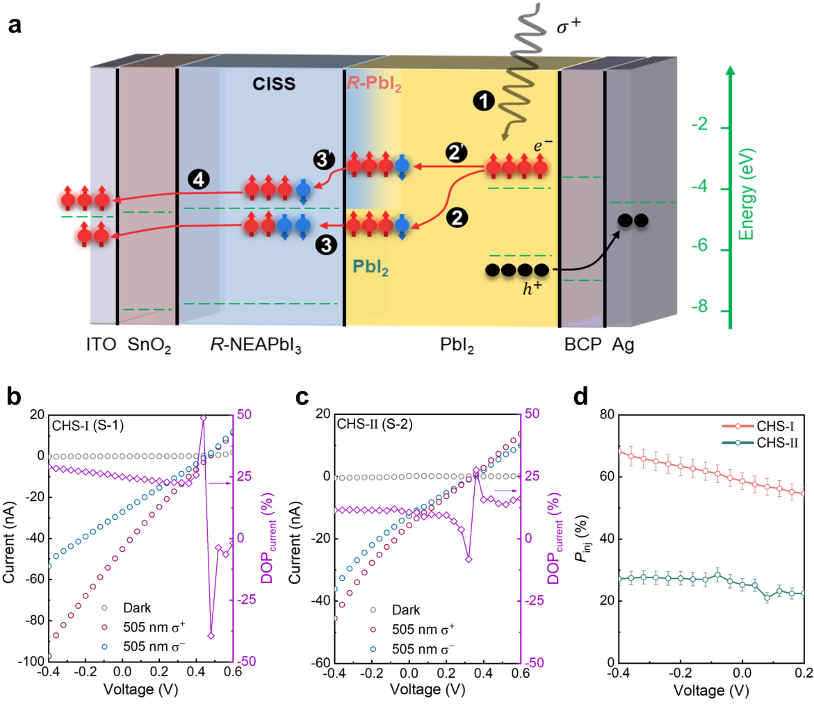 图2 手性异质结界面的原子级精准构建与高效自旋注入:(a) 界面自旋注入效率定量方法;(b) 有手性界面器件的J-V曲线和光电流极化度;(c) 无手性界面器件的J-V曲线和光电流极化度;(d) 有/无手性界面的器件的自旋注入效率。