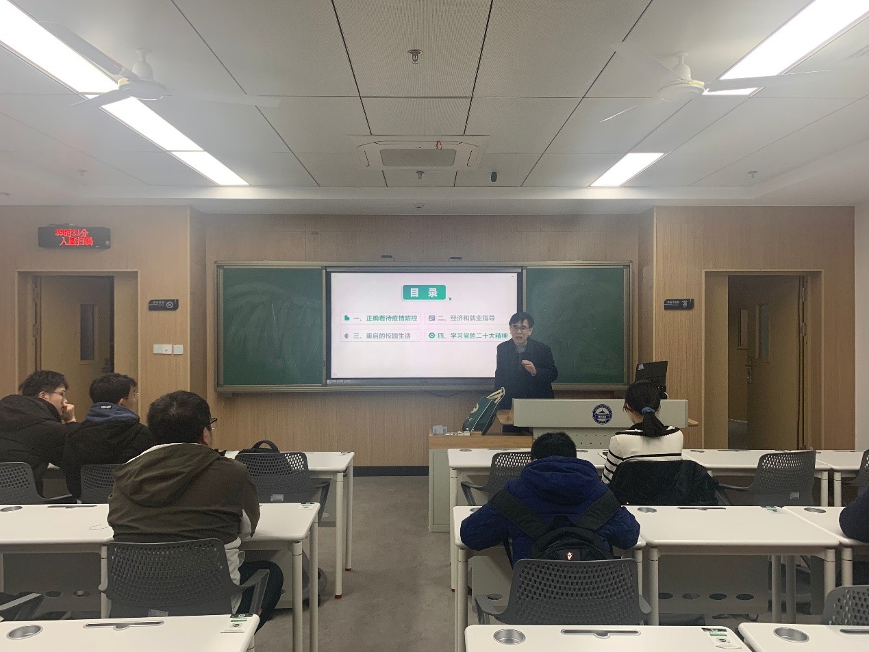 会议开始,宋老师首先提到了刚刚过去的三年疫情。他带领同学们回忆了2020年初疫情肆虐期间医护人员的牺牲和奉献,呼吁我们以平和的心态对待疫情以及之后的一系列疫情带来的挑战。接下来,宋老师分析了后疫情时代下的经济和就业态势。他指出,在三年疫情和中美贸易战的双重影响下,国内经济态势持续低迷。在此情况下,我们既要看到风险,也要看到机遇。风险是外部环境可能带来的,而机遇是国家提供的青年人才的战略机遇。