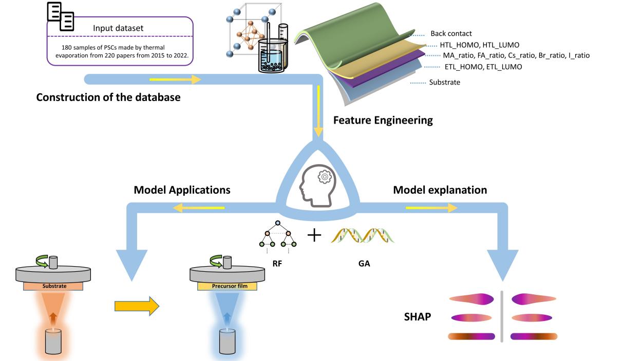 近年来,钙钛矿太阳能电池(PSCs)因其优异的性能和低成本而受到学术界和工业界的广泛关注。其主要制备途径是通过溶液工艺和气相沉积,溶液工艺法制备出的电池表现出破纪录的25.7%的光电转换效率(PCE)和超过2000小时的T80寿命,但对于精确控制以米级为规模和不同批次的钙钛矿结晶仍然是一个挑战。气相沉积的优点是大面积模块制备的潜力大,易于与串联太阳能电池集成,并与现有的工业制造技术兼容。目前关于气相沉积PSC的工作主要依靠试错实验,难以寻找实验参数间的微妙联系,使得气相沉积PSC的PCE相对滞后。因此,研究者提出了机器学习辅助分析及设计气相沉积钙钛矿太阳能电池方法,通过合理的数据提取构建气相沉积PSCs的数据库,并通过模型处理和特征工程构建了性能良好、精度高和通用性强的随机森林(RF)机器学习模型,可以准确预测多种结构及工艺参数的气相沉积PSCs的PCE、Jsc、Voc和FF光伏参数。研究者应用Shapley Additive Explanations(SHAP)算法来探索巨大变量空间中每个特征的关联性,大大缩短后期研究者的实验试错周期。