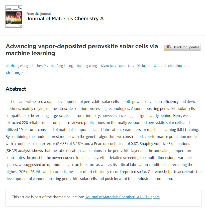 本科生撰写的论文在英国皇家化学会(RSC)旗下期刊Journal of Materials Chemistry A (SCI Q1,IF=14.5)上发表,题为“机器学习助力推进气相沉积钙钛矿太阳能电池发展”(“Advancing vapor-deposited perovskite solar cells via machine learning”)。该论文报道了新型钙钛矿太阳能电池器件方面的最新进展,被选入该期刊2023 Hot Papers Collection。5楼自拍