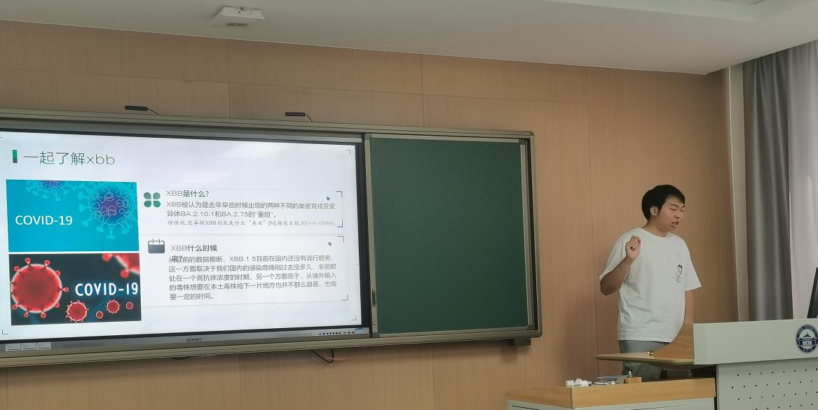 首先,全体同学学习了过去三年我国抗疫的巨大成就,深入了解了中国为全球抗疫做出的贡献。同时,各班班长还带领大家了解了近日引发关注的XBB变异株。通过科普宣传,同学们知晓了XBB的感染病状和用药注意事项,对于防范病株有了更多的知识储备。