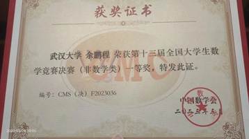 2022级研究生余鹏程同学发挥出色,最终荣获本届全国大学生数学竞赛决赛(非数学类)一等奖。