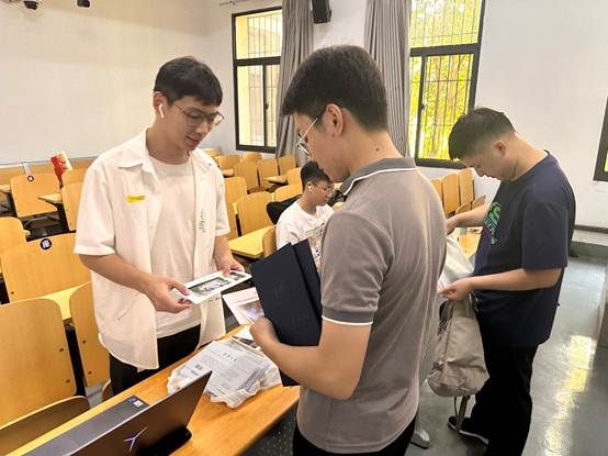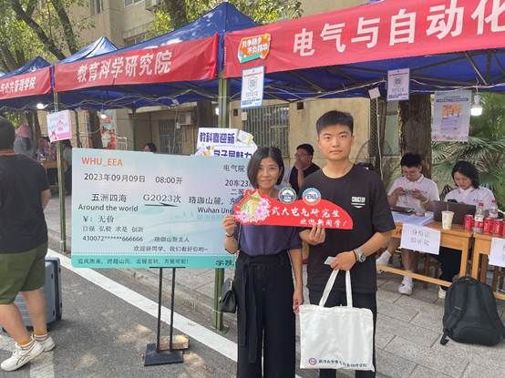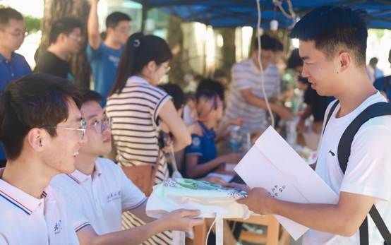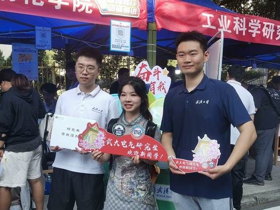 永恒赓续的红色传统;有包含着众多干货的学习手册,彰显学院和研会的人文情怀;还有精心定制的可乐,“强国有我”、“志在四方”、“破万里浪”、“沐光而行”等标语激励新同学们接续奋斗……报道手续完成后,同学们纷纷和立牌、手牌合影留念,记录下这一新的人生起点。