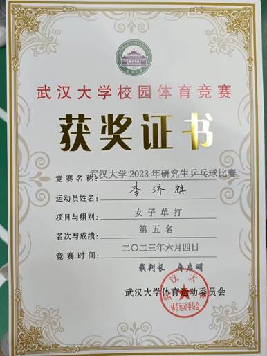积极参与各类赛事并获得如下成绩:在2023年研究生羽毛球赛中荣获混合团体第五名的好成绩,在2023年研究生乒乓球赛中荣获女子单打第五名的好成绩。除此之外5楼自拍