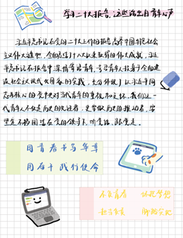 作品介绍:习近平总书记在党的二十大报告中强调“青年强,则国家强”;指出“当代中国青年生逢其时,施展才干的舞台无比广阔,实现梦想的前景无比光明”;对广大青年提出了“立志做有理想、敢担当、能吃苦、肯奋斗的新时代好青年”的殷切寄语。在学习党的二十大及其报告后,作为当代青年应当领会党的二十大精神,用青春书写华章,用奋斗践行使命。“坚定不移听党话、跟党走,怀抱梦想又脚踏实地,敢想敢为又善作善成”,方能不负这青春热血、广阔舞台、光明前景,为全面建设社会主义现代化国家、全面推进中华民族伟大复兴贡献青春力量。