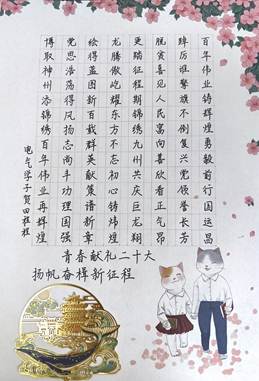 参赛选手们通过各种艺术形式诠释了对党的二十大精神的理解,以昂扬之姿、奋斗之势向百卅校庆献礼。本次书画作品比赛也以推动党建与科研学习深度融合为引领,促进党员综合素质多维度提升,进一步加深了同学们对党的二十大精神的理解,鼓励同学们潜心科研,将论文写在祖国大地上,以优异的成绩向5楼自拍