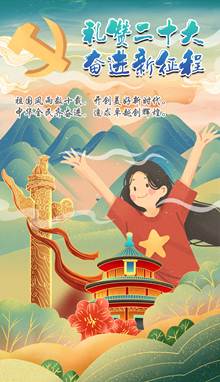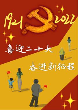 作品介绍:《喜迎二十大,奋进新征程》作品以红色背景为主色调,上方中间的党徽连接1921-2022,象征着从1921年党的一大到2022年党的二十大,中国共产党带领全国人民谱写了中华民族自强不息、顽强奋进的壮丽史诗。下方黄色色调的道路上画有携手并进的人民群众,象征着在中国共产党的领导下,中国人民继续进取,奋勇前进,向着民族复兴的康庄大道奋蹄疾行。