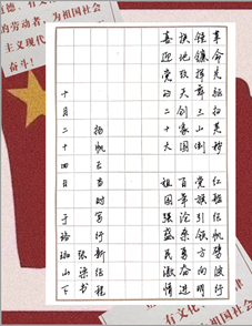 作品介绍:一百年同舟共济,一百年风雨兼程。吾辈青年,应当擎起信念之旗,以青春之姿,担国之使命。过往几代人艰苦卓绝,以铁肩担道义,方换来今日的河清海晏、山河无恙。在个人命运与国家命运紧密相连的今日,作为新时代的青年,更应以中国梦激扬青春梦,以凌云壮志,迎接二十大,奋进新征程。与时代同行,与祖国同进,肩负实现中华民族伟大复兴中国梦的使命与担当,始终听党话、跟党走。不负时代,不负韶华,不负党和人民的殷切期望,让理想信念在艰苦奋斗中升华,让青春在扬帆奋楫中熠熠生光!
