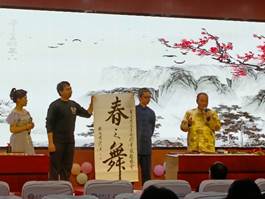 离退休教职工代表将太极与书法在舞台表演中相结合,为大家带来了一场中国传统文化的表演盛宴。其中太极步法以柔克刚,尽显中国人的哲学思想;书法则又包含祝福,一幅门心寓意“五福临门”,一幅“春之舞”寓意“莺歌燕舞,载歌载舞,舞动青春”。动静之间,笔墨之中,承载着中国深厚的文化底蕴。