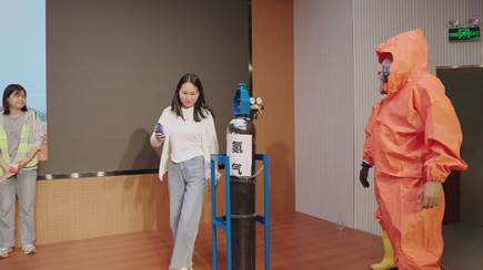 随后,培训做“气瓶安全”专项实操演练。工作人员为师生现场演绎氢气泄漏时相关部门的应对流程,使学生掌握气瓶泄露时的应对措施。与会师生纷纷参与到演练中,亲身体验了应对氢气泄漏的全过程。他们不仅学习了如何识别泄漏迹象、如何报警求助、如何疏散逃生等关键技能,还通过实际操作加深了对气瓶安全知识的理解。
