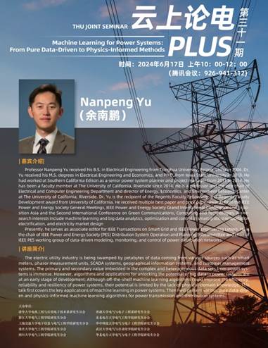 Prof. Nanpeng Yu has been with the University of California, Riverside since 2014. He is a professor and the vice chair of Electrical and Computer Engineering Department and director of Energy, Economics, and Environment Research Center at The University of California, Riverside. Prof.Yu currently serves as an Associate Editor of IEEE Transactions on Smart Grid and IEEE Power Engineering Letters, and is the Chair of the IEEE PES Distribution System Operations and Planning Group and the IEEE PES Data-Driven Modeling, Monitoring, and Control of Electric Distribution Networks Working Group. He has a long history of research in the areas of machine learning and big data analytics, optimization and control of smart grids, transportation electrification, and power market design.