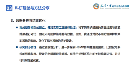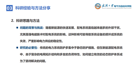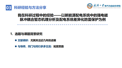 接下来,杨泽鸿同学以他自己在研究生期间的课题:新能源配电系统中的强电磁脉冲耦合暂态机理分析及配电系统差异化防雷保护为例,分享了自己的科研经验与方法。首先在选题与课题背景研究方面,他强调文献调研一定要特别关注近几年的进展,关注问题的背景与挑战及其研究的必要性,同时要与导师、同门与同行多多交流,拓宽思路。