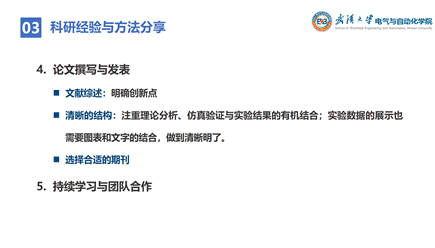 在研究过程最终的论文撰写与发表方面,杨泽鸿同学强调在文献综述部分要明确创新点;行文保持清晰的结构,注重理论分析、仿真验证与实验结果的有机结合,实验数据的展示也需要图表和文字的结合,做到清晰明了,同时要根据稿件的研究层次选择合适的期刊投稿。