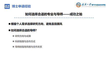 首先,杨泽鸿同学分享了他的博士申请经验。他强调选择合适的专业和导师是成功之始,各位同学一定要根据个人需求选择研究方向,避免盲目跟风。在选择导师的时候要从研究方向与成果、科研氛围与合作方式和导师的指导风格与合作关系三方面对意向导师进行全方位的评估。