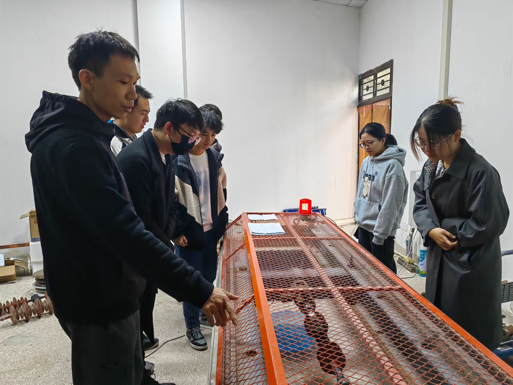 高电压绝缘监测实验室参观学习开始,来自电机与自动化学院的李元杰博士带领同学们了解了高电压绝缘子材料的储存室和绝缘材料检测以及绝缘子拉伸实验,向各位同学介绍了5楼自拍