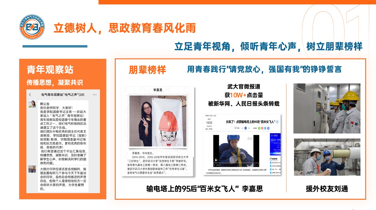 学院学生会立足青年视角,设立电气青年观察站,倾听学子心声;依托新媒体平台,树立朋辈榜样,高空巡线女飞人李嘉思被人民日报等顶流媒体转载、援巴基斯坦校友刘通书写用青春践行“请党放心,强国有我”的铮铮誓言。