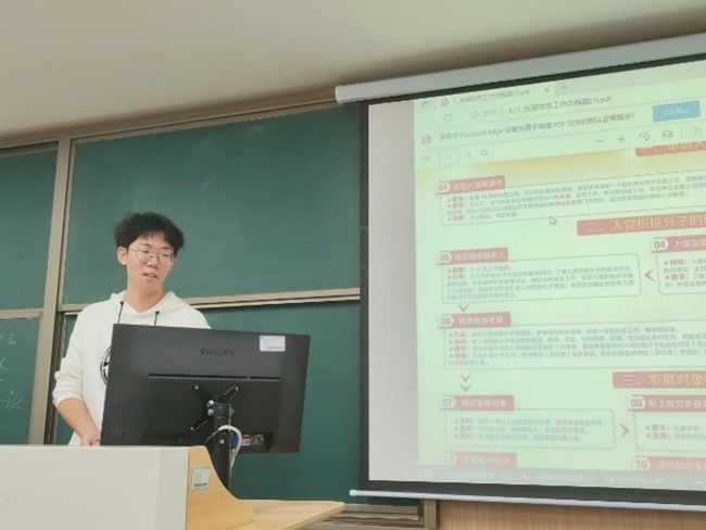 活动第三项,由各班班助为大家介绍入党流程。各班班助从入党申请条件、入党程序、各阶段材料撰写要求和注意事项等方面为同学们进行了系统讲解,引导同学们要始终以党员的标准严格要求自己,按时向党组织汇报思想情况。班助们强调,同学们应该树立牢固的共产主义信念,强化信仰感召,付诸实际行动,鼓励同学们将本次学习成果转化为讲实践的定力、勇担当的魄力、抓落实的能力,积极踊跃地向党组织靠拢,以自己的实际行动争取早日加入中国共产党。