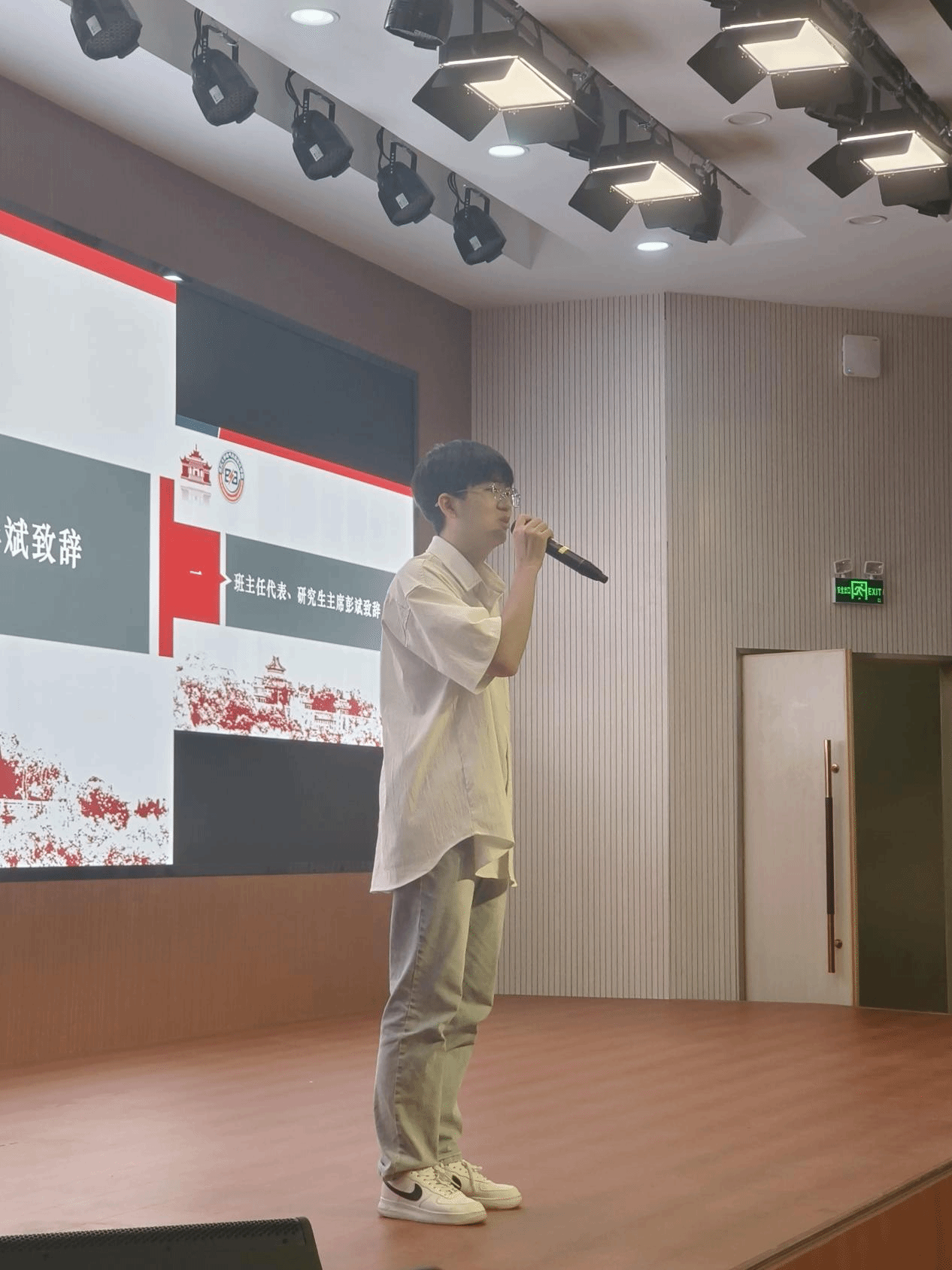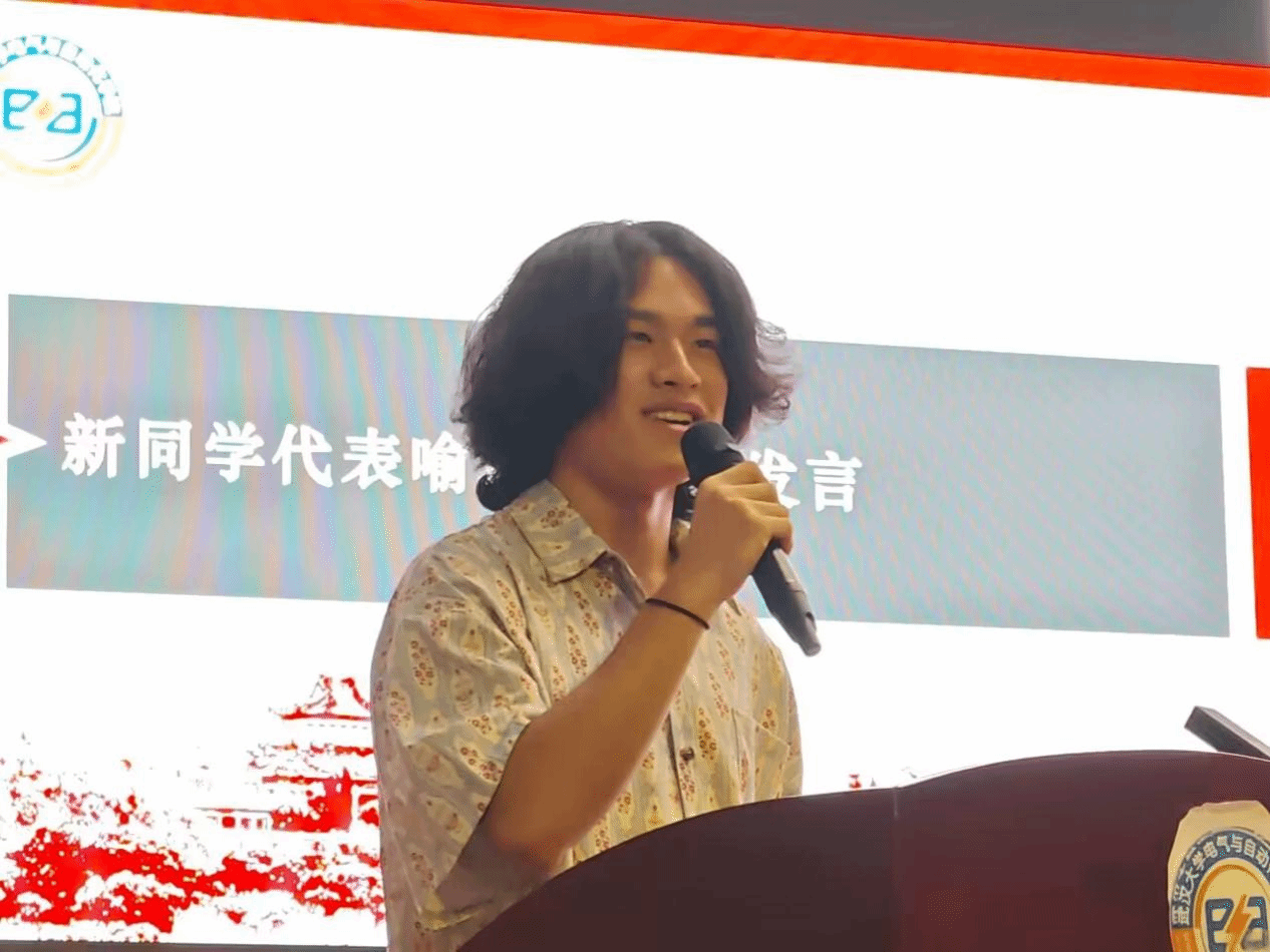 来自电气3班的新同学代表喻培轩同学进行发言,他分享了自己一年来的丰富多彩的大学生活,同时也勉励大家“未来还很长”,大家都要多做尝试。