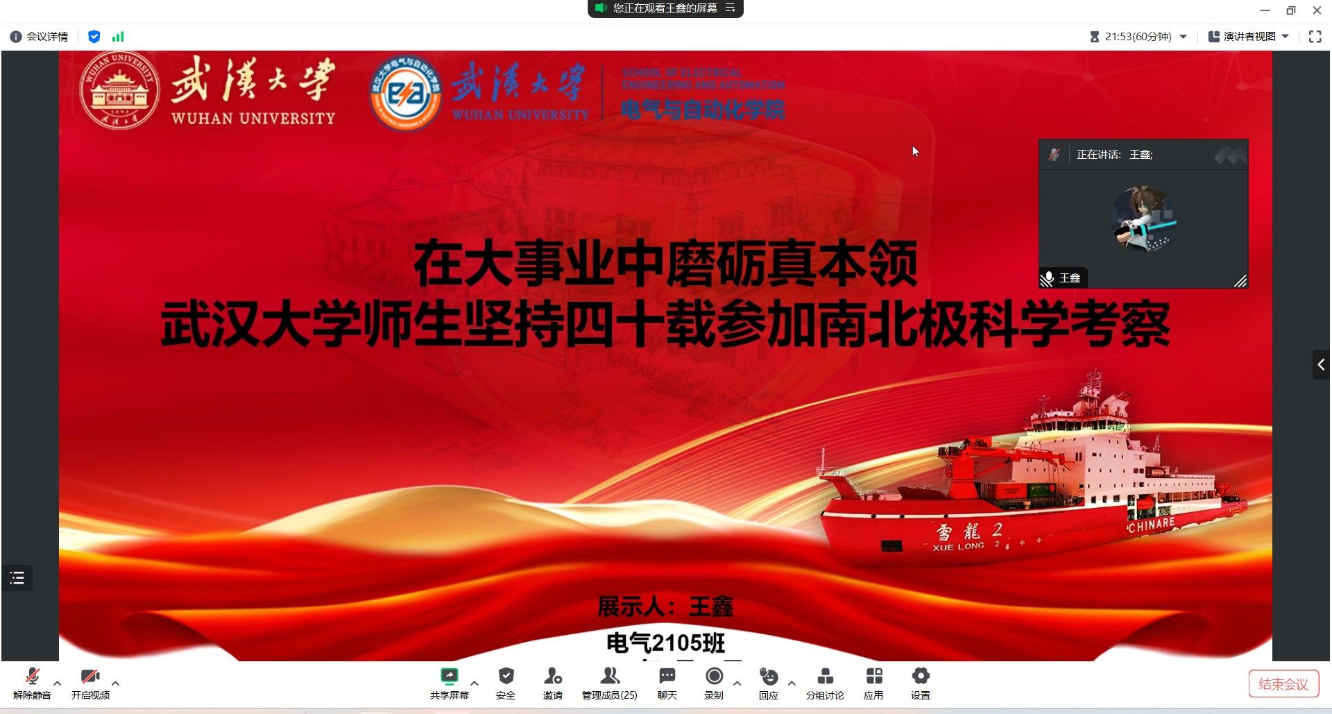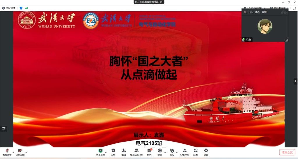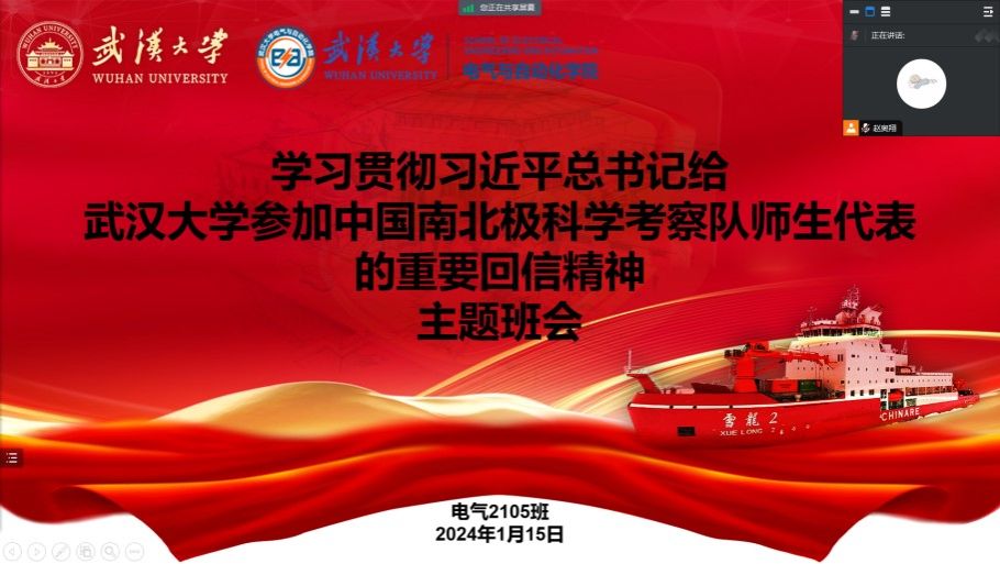 第二位分享者宋扬同学,以“测绘人勇闯南北极地,电气人亦当紧跟脚步”为主题,从电气学子的角度发表了自己的看法。武大测绘奋勇直前,我们作为电气学院的学生,也应该做出更大的贡献。习近平总书记的重要回信是我校办学历史上具有里程碑意义的大事,宋扬同学号召大家要在总书记重要回信精神激励鼓舞下,努力学习、艰苦奋斗、担当使命责任,为建设教育强国、科技强国、人才强国贡献力量。
