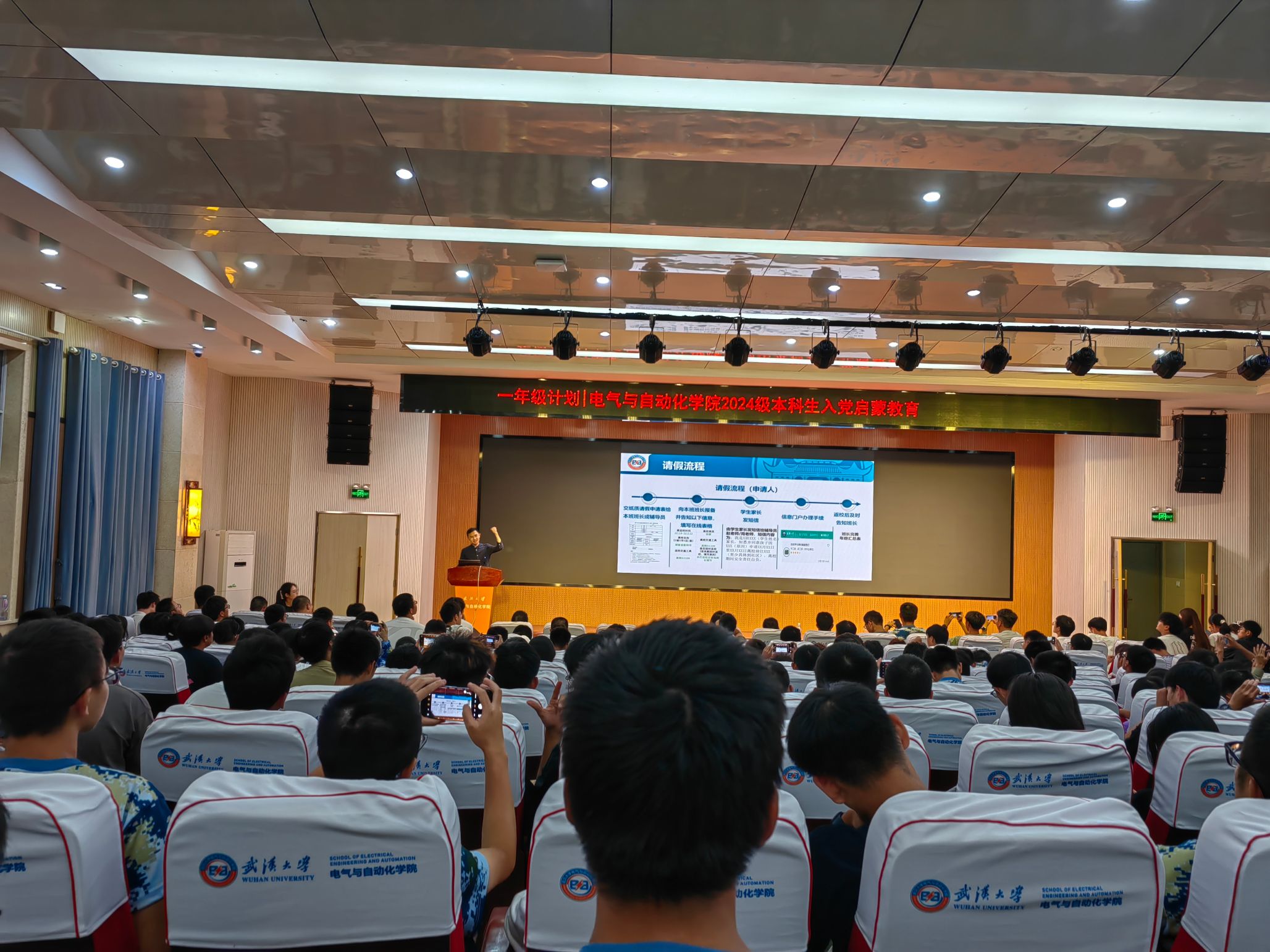 于本院报告厅召开入党启蒙教育大会。本次会议由兼职辅导员何湘凌老师主持;辅导员周兵奇老师、院2020级本科生党总支支委、8班班助罗海宁参加;博士生宣讲团成员苏大智讲师受邀宣讲。2024级智电1、2班及电气1-8班同学与会。