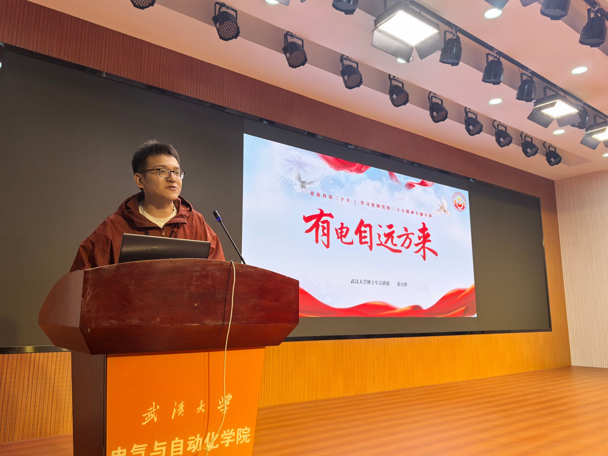 “用青年视角阐释党的理论,用青年话语宣传党的主张。”会议之始,博士生宣讲团成员苏大智同学进行了题为“有电自远方来”的宣讲。 他以党的二十大“深入推进能源革命”战略规划为切入点,结合中国电力发展历程,展现了在中国共产党领导下一代代电气人踔厉奋发、笃行不怠,建设电力强国的壮阔图景。从一场电动升旗到特高压线路飞跨山河,从缺少设备、技术的建国初期到“让中国标准成为世界标准”的有为新时代,党旗所指就是青年所向。从雪域珠峰,藏中高原,到走向世界,中国式现代化中,亦从不乏武大电气的身影。