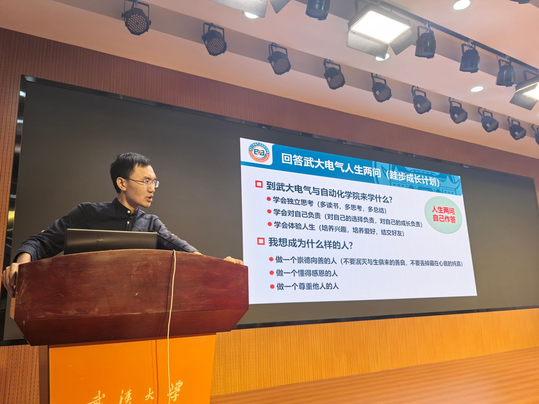 周老师首先以“在武大电气的人生两问”为开端,激发同学们的思考。以如何对答为纲,周老师强调了独立思考与深度思考的重要意义,倡导对自己负责的人生态度,鼓励大家多元体验人生。树人之要,立德为基。周老师着重诫勉同学们做一个崇德向善、懂得感恩、尊重他人的人。他的言语鞭辟入里又深入浅出,分析了个人亲身体验在纷繁复杂他人意见中的决定性作用,鼓励同学们多思考,多实践,在没有标准答案的成长之路上用实际行动写就独属自己的青春答卷。