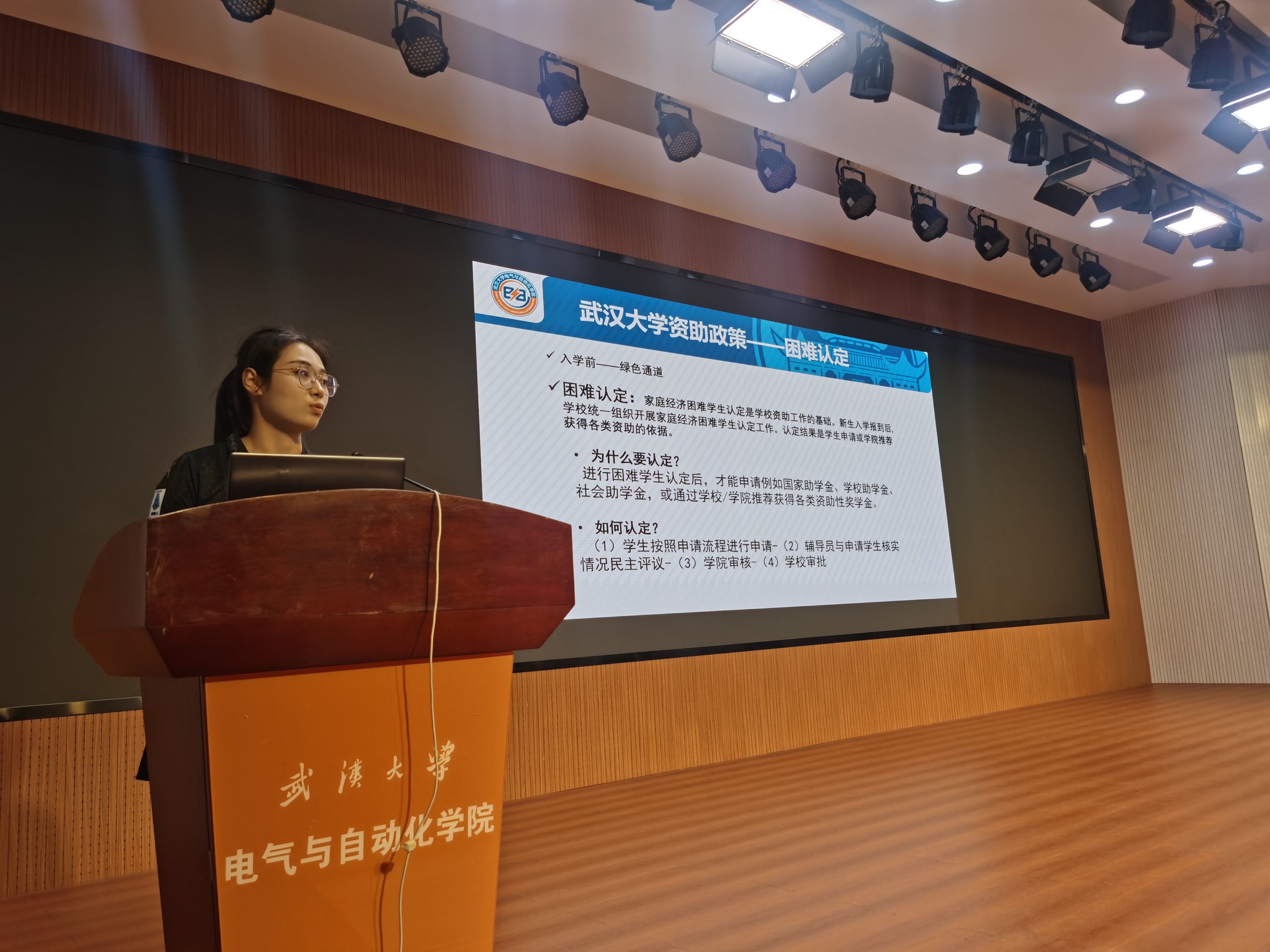 最后,由兼职辅导员何湘凌老师为新生介绍困难认定流程、武大资助政策、请销假制度以及生活权益服务等事项。她的话语清晰利落,拒绝生硬死板,贴近学生生活,设身处地地从实际出发,解决同学们的种种困惑,为大家在珞珈山安全愉快的生活保驾护航。