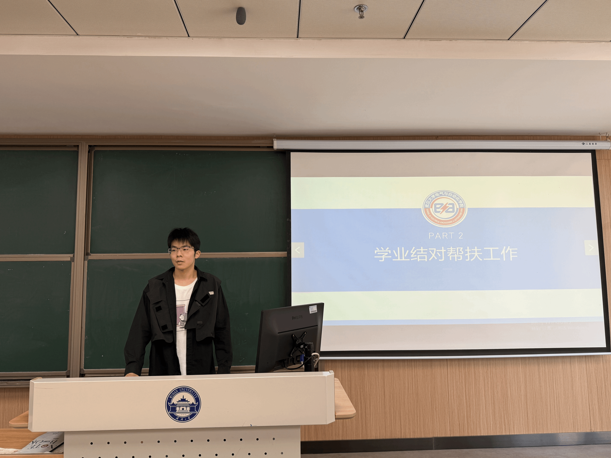 第三项,学业结对帮扶工作。 会议的最后,重点讨论了学业结对帮扶工作。郭佳赋老师指出,学业结对帮扶是学院学生工作的重要组成部分,要求学生党员们积极参与,通过结对帮扶,帮助学习状态不太好的同学调整学习状态。学生党员们就如何更有效地开展学业结对帮扶工作提出了建设性的意见和建议。