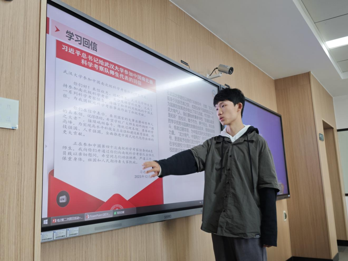 1日上午,团日活动会议在工学部主教学楼教室内举行。会议初始,暖场游戏“你画我猜 我们的武大”迅速激活了现场氛围。同学们踊跃参与其中,凭借生动的比划与精彩的猜测,一个个与武大紧密相关的关键词被准确识别,欢声笑语在活动现场久久回荡,为整个团日活动营造出轻松愉悦的良好氛围。