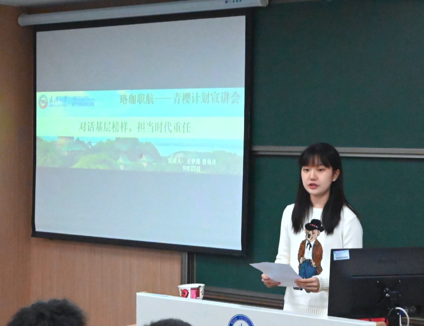 面向2025级本科生举办“珞珈职航之青樱计划”主题宣讲会。本次活动是学院“一年级计划”的重要组成部分,旨在帮助新生深入了解基层实践,规划未来发展路径。25级辅导员陈依鸣主持宣讲会。