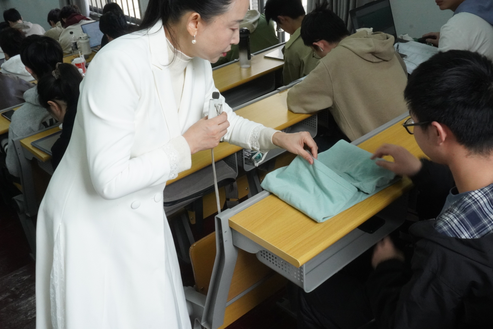 课程特别设置了丰富的实操环节。在叠衣法教学中,同学们学习了麻理惠叠衣法的三个诀窍:将不规则衣物整理为整齐长方形、小件衣物用收纳盒分隔收纳、过季衣物压缩存放。在陈老师的亲自指导下,同学们纷纷拿起分发的衣物,尝试自己动手将衣服叠得整整齐齐。同时,现场助教也为同学们完整而详细地展示了叠衣和收衣的技巧。