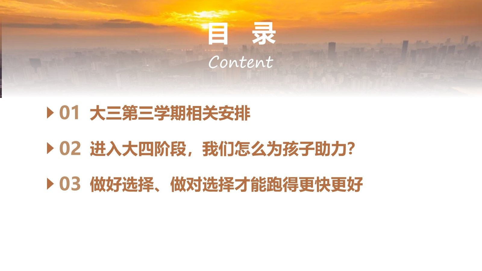 本次线上家长会旨在向家长介绍大三学年第三学期的相关安排,解答家长在孩子学习、生活、未来发展方面的疑惑,引导家长根据实际情况帮助孩子做好选择、做对选择,以教育合力帮助学生在大四这一关键学年的发展。